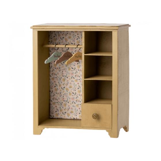 In this big wardrobe, your Maileg friends can place their clothes and accessory. It has beautiful details like the 3 small hangers in different colors, and a beautiful Maileg fabric covers the back wall of the closet.Size: LargeHeight: 12.99 in.Width: 5.11 in.