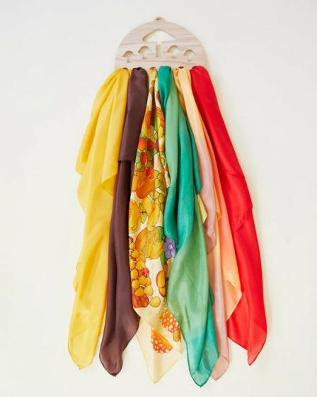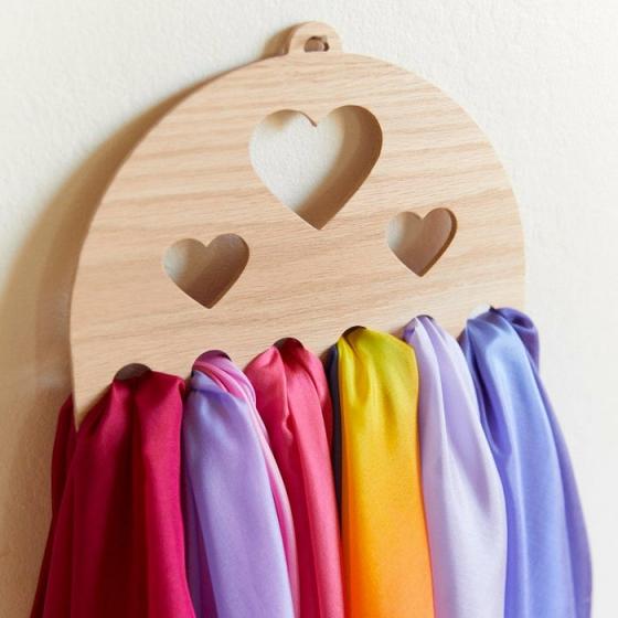 A beautiful display option for homes and classrooms. Simply hang on a wall and slip your Playsilks through! Easy and fun for children learning to care for their toys and encourages young ones to keep playrooms tidy.6 display holes, 1/2″ diameterMeasures: 12″ x 6″ x 1/4″Made from Red Oak MDF safe for childrenInstallation hardware not included. We recommend using a screw to secure the display to your wall.Thoughtfully made in California, USA.Sustainably MadeOur wooden toys are made by hand in California, USA, from all natural wood.Care InstructionsWipe down and clean using a drop of soap and lukewarm water.