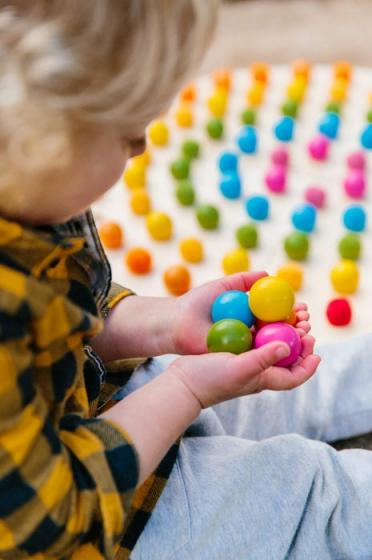 My Rainbow Globe features beautiful bright colours and so many learning opportunities all rolled into one fantastic toy. A puzzle and sorting toy combined, children can use their creativity to sort colours, or design patterns filling up the puzzle with their favourite coloured wooden or felt balls, both of which are included in this set. This one is the perfect aid for recognising colours and developing those fine motor skills. As children become more confident the Rainbow globe can be used to engage children to develop early math skills such as practice counting, pattern making, fractions and other basic mathematical concepts. The set includes 90 wooden balls, 90 felt balls and 4 large wooden puzzle piece bases.Learn more way to play with The Freckled Frog through: The Freckled Frog – Learn Through Play184 pieces in each set.Approximately each base piece is 29cm x 29cm with the thickness of 1cm and balls are 3cm in diameter.Made with FSC plywood, schima & felt.Suitable for children three years and over.